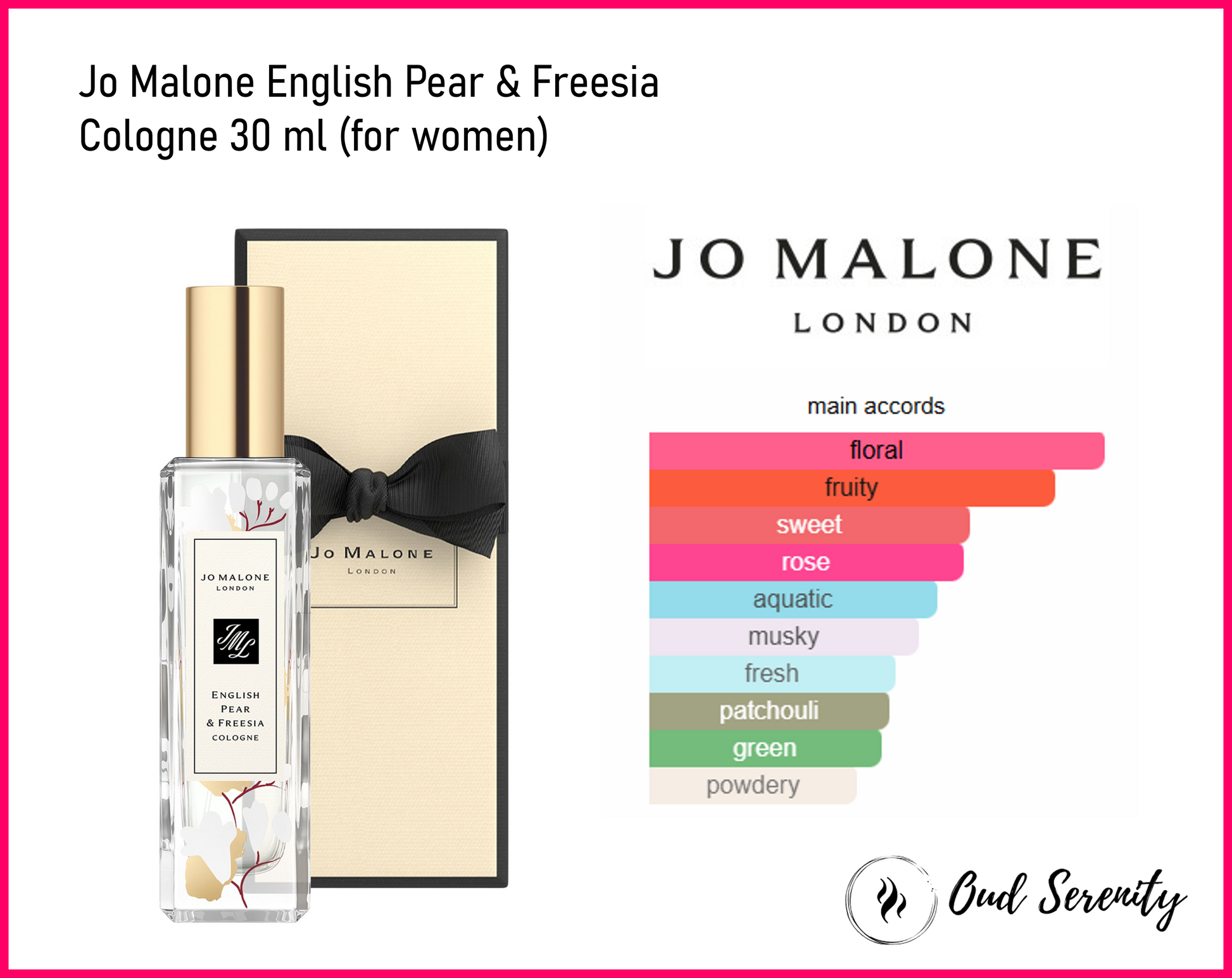 Jo Malone English Pear & Freesia Cologne is a fresh, fruity-floral fragrance for women that captures the essence of an English orchard at the turn of the seasons—where summer ripens into autumn. It was launched in 2010.