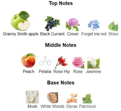 Top notes are Granny Smith apple, Black Currant, Clover, Forget me not and Shiso